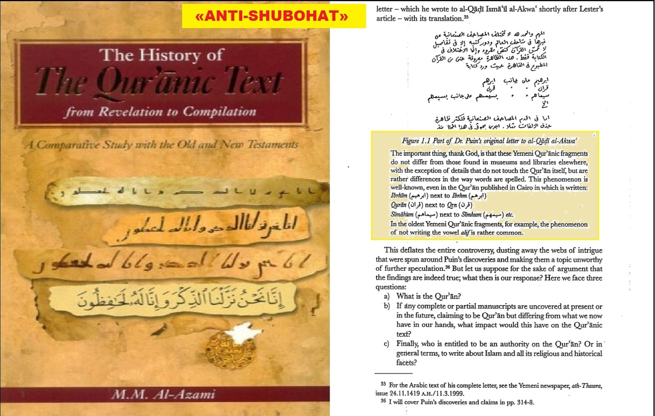 [3] Source: Puin's letter and Prof. Azami's comments cited from: M. M. Azami, The History of the Qur'anic Text from Revelation to Compilation: A Comparative Study with the Old and New Testaments, UK Islamic Academy, 2003 pp. 12. Ссылка на книгу : нажмите